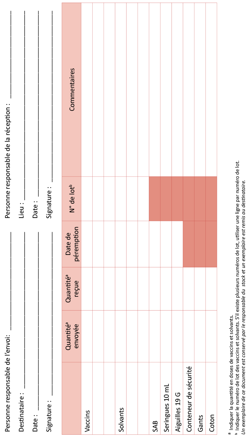 Permalink Descargar Commentaire Return to top Sommaire Télécharger 'Formulaire de livraison des vaccins et du matériel' (document Word) Path Liens transversaux de livre pour Appendix 33. Delivery form for vaccines and vaccination supplies Annexe 32. Fiche de stock Annexe 34. Préparation et conservation des vaccins lors des campagnes de vaccination de masse
