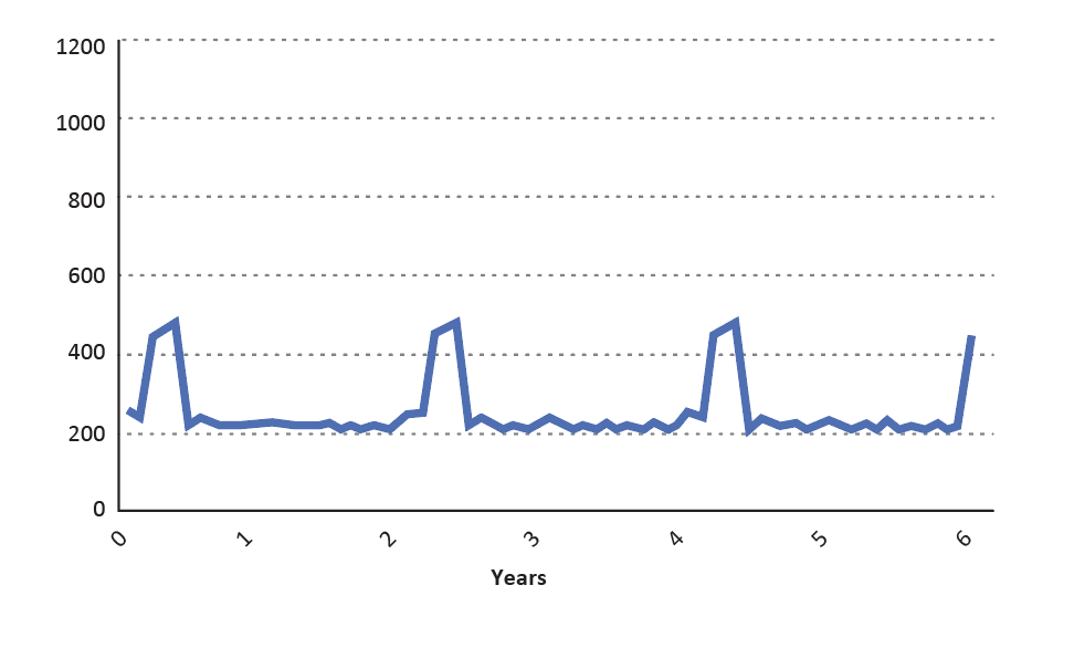 Remarque : on suppose ici qu’il n’y avait pas de sujets susceptibles à l’année 0 et que l’épidémie déclarée à l’année + 3 a réduit le groupe de susceptibles à néant à la fin de l’année, ce qui n’est jamais le cas dans la réalité.